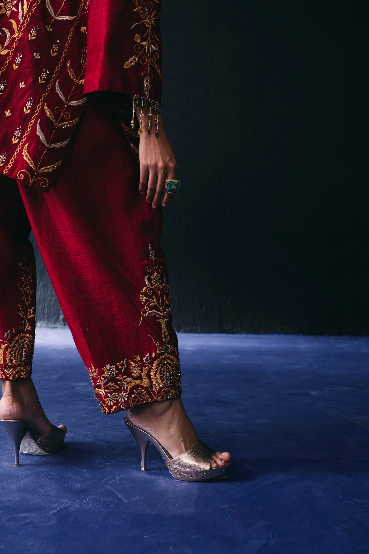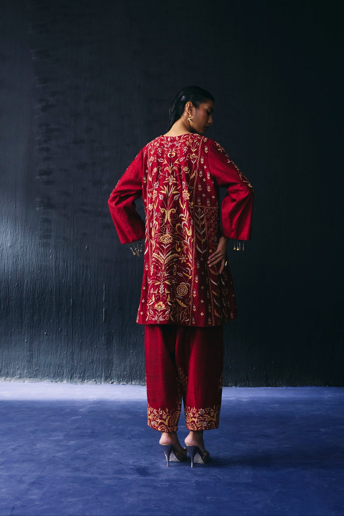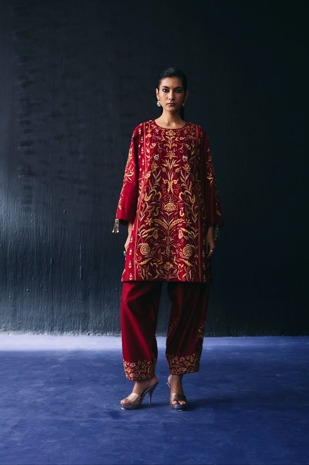Maroon rawsilk embroidered kurta is paired with embroidered pant and accentuated with beads hanging on sleeve.