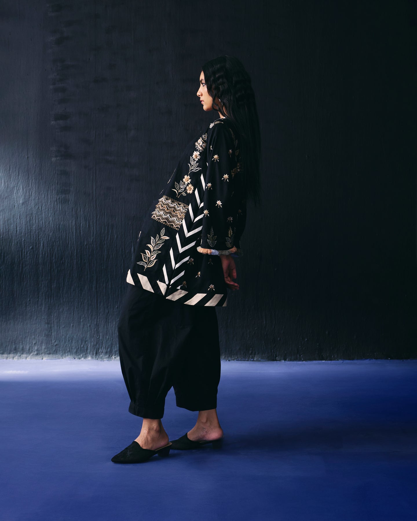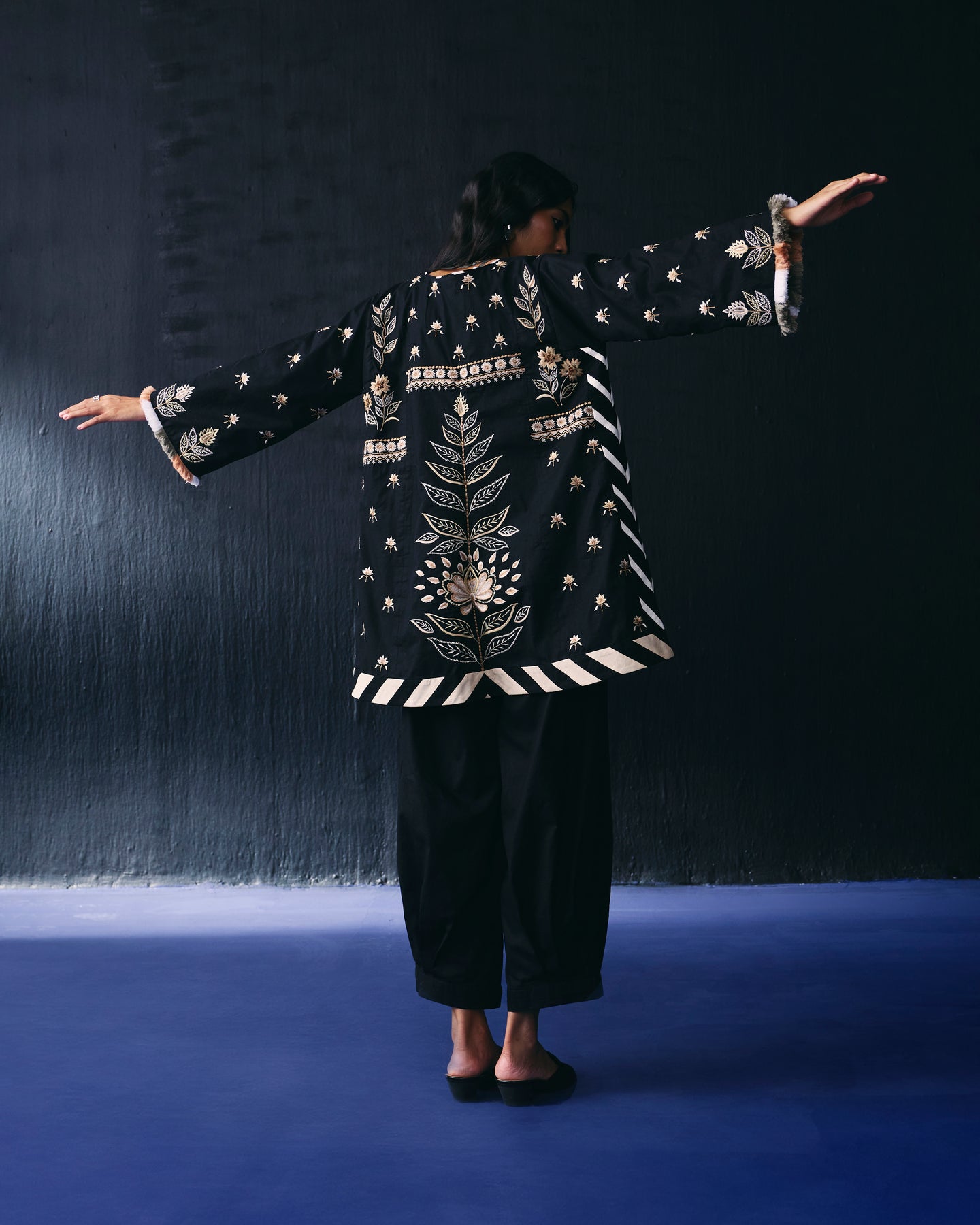 Black cotton kurta has floral thread embroidery and paired with pants and detailed with thread fringes.