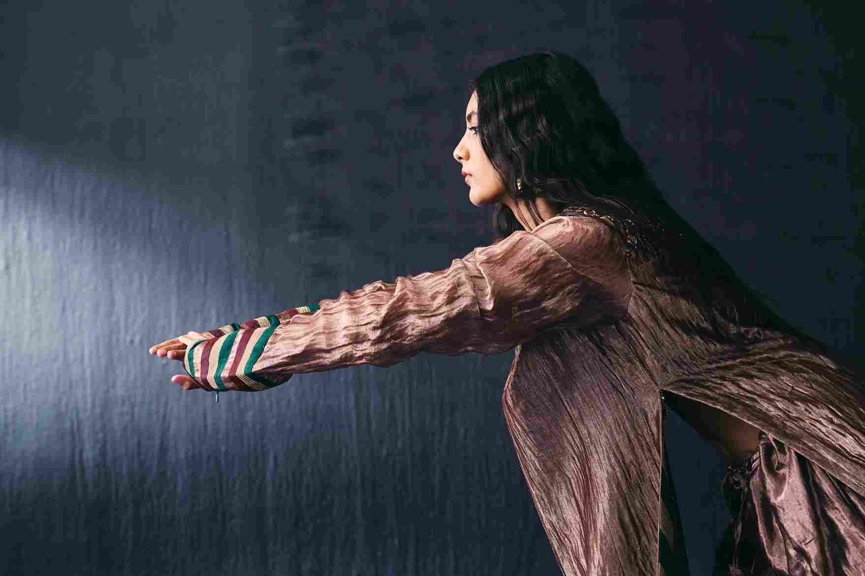 High yoke crystal zardozi embroidered kurta paired with Tissue pant and multicolor strip details on sleeve cuff.
