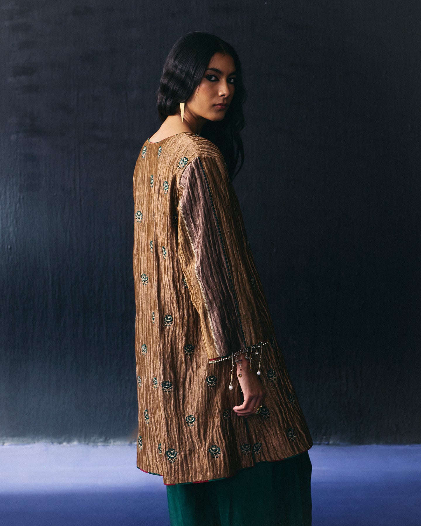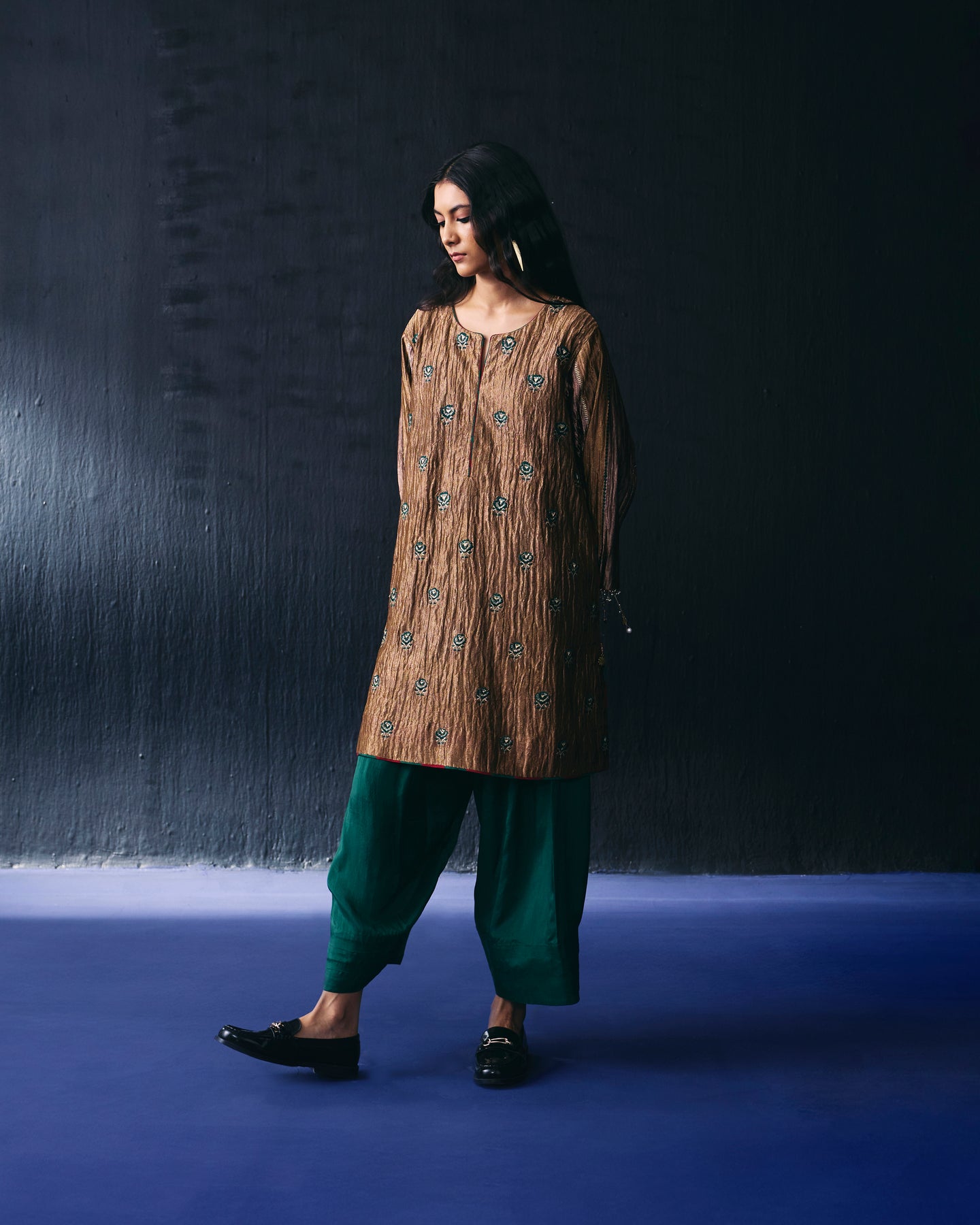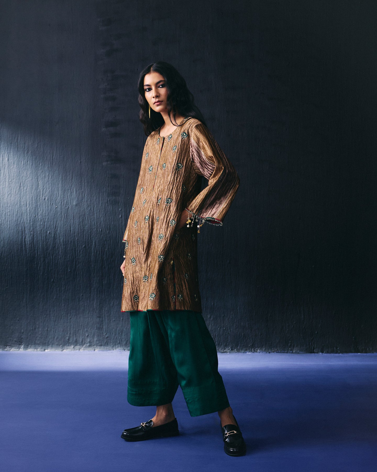 Gold tissue embroidered kurta is paired with green silk pant and accentuated with beads hanging.