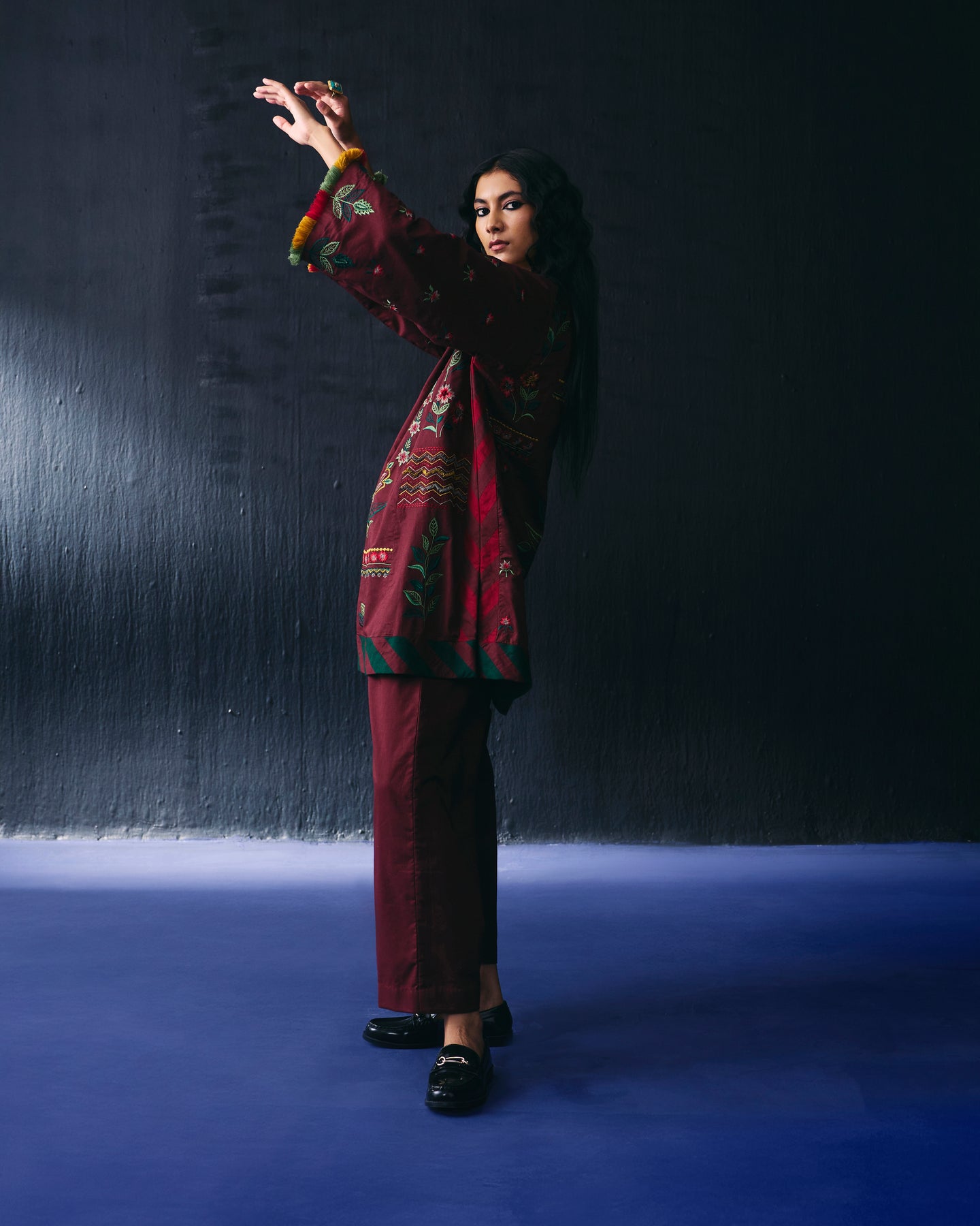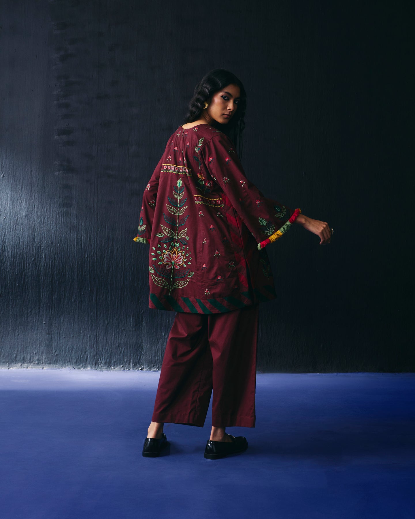 Maroon cotton kurta has multi color floral thread embroidery and paired with pants and detailed with thread fringes.
