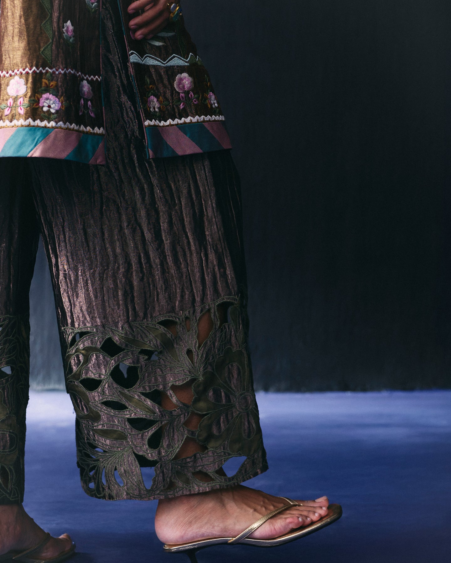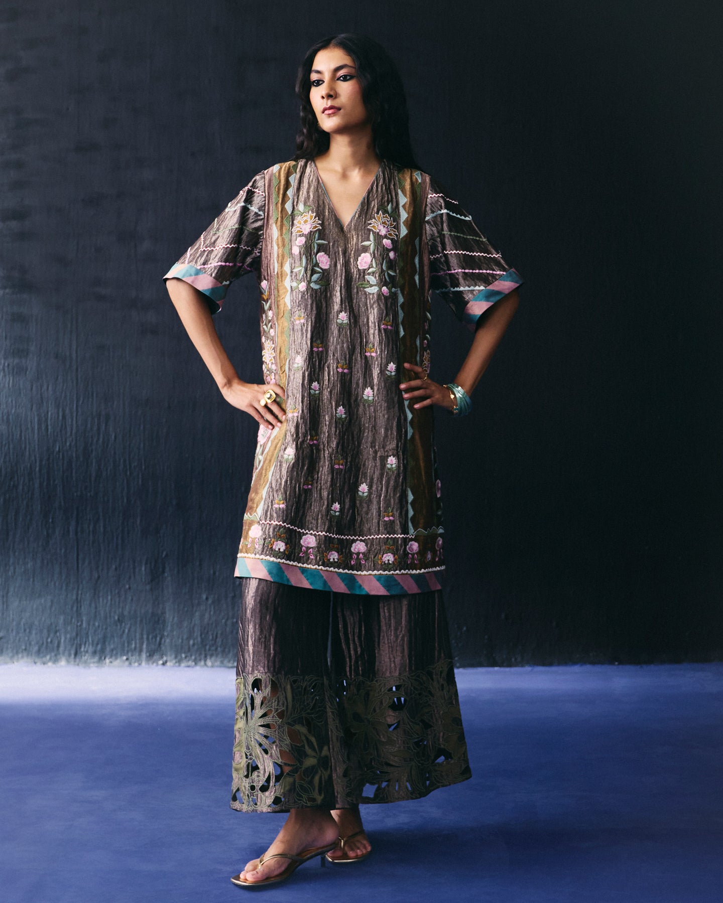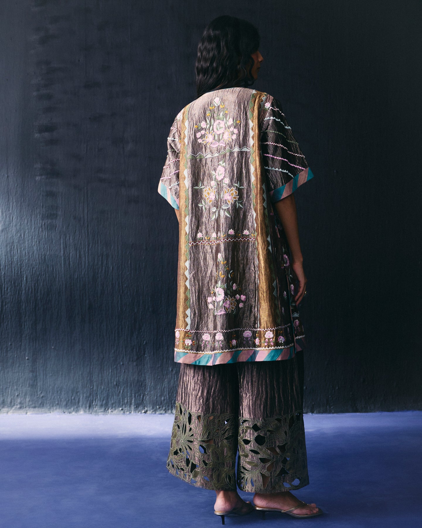 Multi color pannled tissue kurta has all over thread embroidery and paired with Tissue cutwork pant.